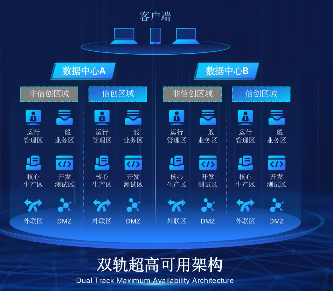 神州mksport体育在企业面临自主创新IT基础重构过程中,推出的全新架构双轨超高可用架构(简称DTMAA),在双活数据中心的分区调度基础上,添加每个数据中心内信创域和非信创域的分域调度,来实现分区分域协同的多活双轨超高可用。